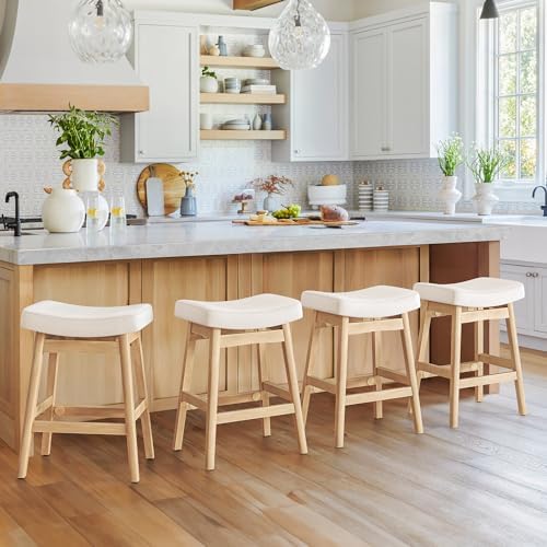View full detailsBar Stools Set of 4, Barstools with Sturdy Wood Legs, Saddle Seat Counter Height Bar Stools for Kitchen Counter, Bar, Dining, 24 Inch Farmhouse Counter Stools, Antique White Leather