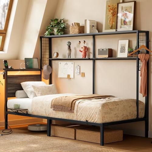 View full detailsVASAGLE Twin Size Metal Bed Frame with Headboard, Multifunctional Storage, Built-in LED Lights, Charging Station, Bookshelf, Bedside Shelf, Space-Saving, No Box Spring Needed, Ash Brown URMB963K01