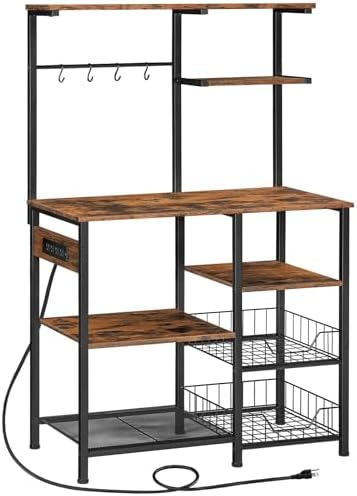 View full detailsHOOBRO Large Bakers Rack with Power Outlets, 6-Tier Microwave Stand with 4 Hooks, Coffee Bar, Kitchen Shelf with Wire Basket, for Kitchen, Living Room, Office, Rustic Brown and Black BF64UHB01