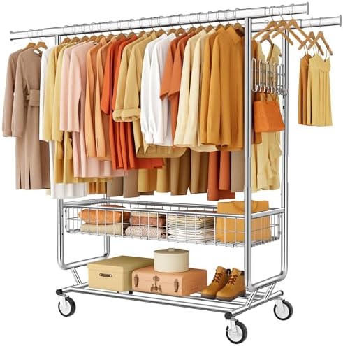 View full detailsHeavy Duty Clothes Rack Load 720 LBS Double Rod Clothing Rack with Basket for Hanging Clothes 450+ Rolling & Adjustable with Hook Garment Rack on Wheel for Bedroom Laundry Room Retail Store