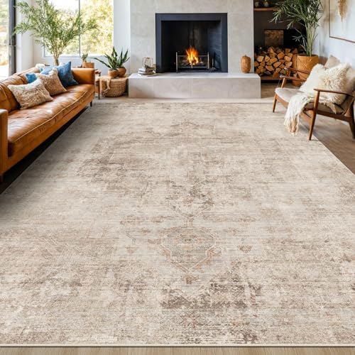 View full detailsNeutral Living Room Rug - 10x14 Farmhouse Beige Brown Large Area Rug for Dining Room, Bedroom, Low Pile Lightweight Washable