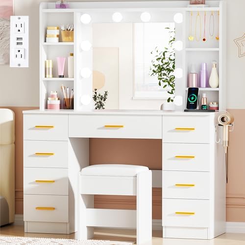 View full detailsANWBROAD Makeup Vanity Desk with Lights White Vanity Desk with Mirror and Lights 3 Colors, 9 Drawers, 6 Storage Shelves, 5 Hooks Dressing Table with Stool Power Outlet for Bedroom Girls Women UBDT87W