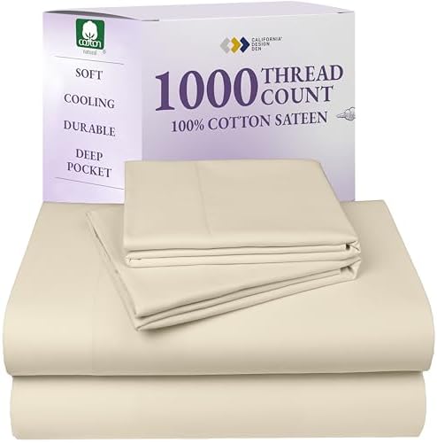View full detailsCalifornia Design Den Thick and Natural 100% Cotton Sheets King Size Set - Luxury 1000 Thread Count Sateen, Deep Pocket King Bed Sheet Set, Durable Bedding - Ivory (Creamy Beige Tone)