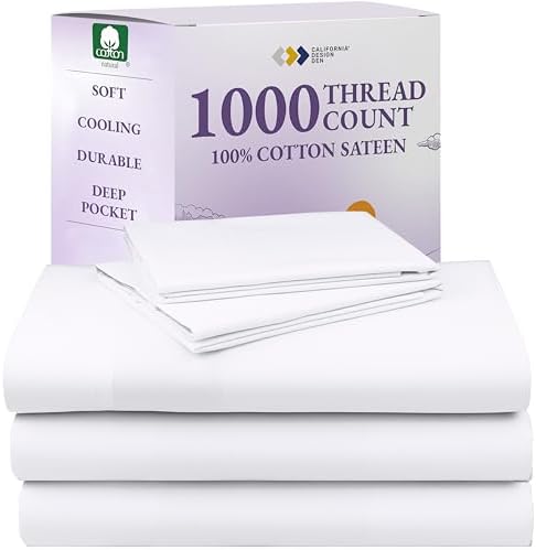 View full detailsCalifornia Design Den California King Sheet Sets - Luxury 1000 Thread Count Sateen Sheets, Thick and Natural 100% Cotton, Deep Pockets, Durable Bedding Set - White