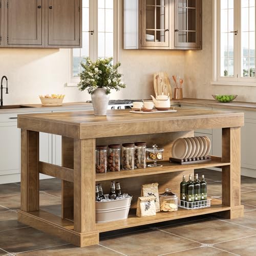 View full detailsTribesigns Kitchen Island with 3 Shelves, 55 Inches Width Kitchen Shelf with Large Worktop, Stable Wooden Structure, Farmhouse Style, Easy to Assemble, Light Brown