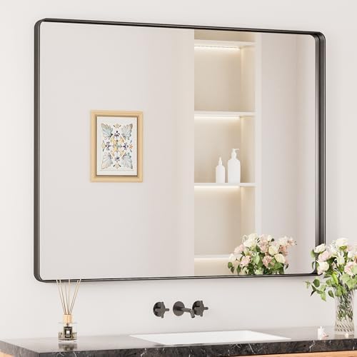 View full detailsKeonjinn Black Bathroom Mirror for Over Sink, 42 x 36 Inch Large Rounded Rectangle Bathroom Vanity Mirror, Matte Black Farmhouse Wall Mirror, HD Tempered Glass, Seamless Aluminum Alloy Frame Mirror