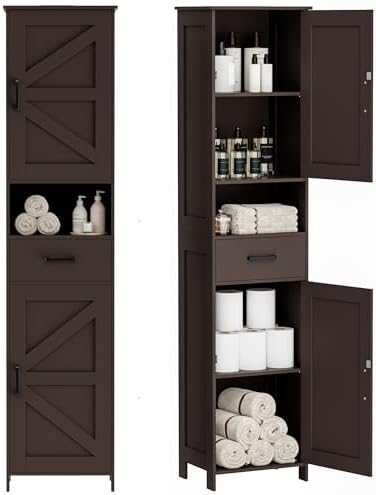 View full detailsHomhedy 67" H Tall Bathroom Storage Cabinet with 2 Barn Doors and 1 Drawer, Narrow Storage Unit, Adjustable Shelves, Floor Cabinet for Bathroom, Living Room, Entryway, Kitchen, Brown, (15.7" W)