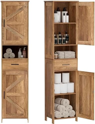 View full detailsHomhedy 67" H Tall Bathroom Storage Cabinet with 2 Barn Doors and 1 Drawer, Narrow Storage Unit, Adjustable Shelves, Floor Cabinet for Bathroom, Living Room, Entryway, Kitchen, Rustic Walnut, (15.7"W)