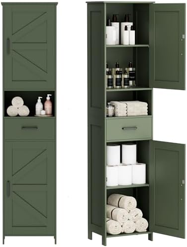 View full detailsHomhedy 67" H Tall Bathroom Storage Cabinet with 2 Barn Doors and 1 Drawer, Narrow Storage Unit, Adjustable Shelves, Floor Cabinet for Bathroom, Living Room, Entryway, Kitchen, Green, (15.7" W)