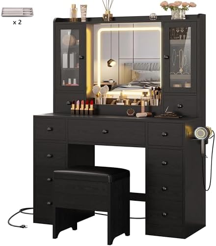 View full detailsIRONCK Vanity Desk with LED Lights Mirror and Charging Station, Makeup Vanity Table with Jewelry Armoire, Storage Bench, and 11 Drawers,Black