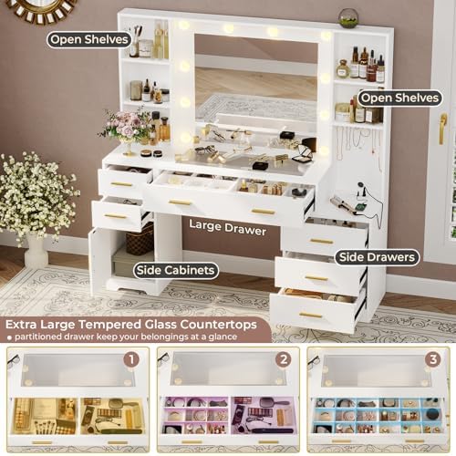 View full detailsHasuit 48.8'' Large Vanity Desk with Lighted Mirror & Power Outlet, White Makeup Vanity Table with 6 Drawers, 4 Shelves and 1 Storage Cabinet, Glass Tabletop Bedroom Dressing Table, 3 Lighting Modes