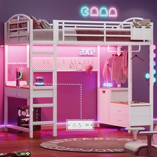 View full detailsLoft Bed Twin Size with Desk,4 Drawers,Power Outlet and LED Lighted,Cloth Rack,1 Storage Hamper,45.3" Pegboard with Hooks,No Box Spring Needed,Space-Saving,Noise Free (White)