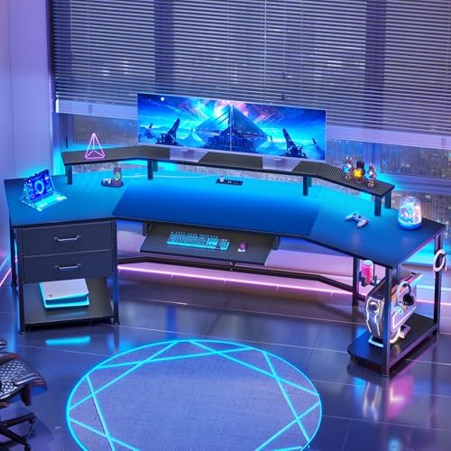 View full detailsItaar 79" Gaming Desk with 2 Fabric Drawers, Long Computer Desk with Power Strip & LED Lights, U Shaped Desks with Storage and Cup Holder, Large Gaming Table for Bedroom, Carbon Fiber Black