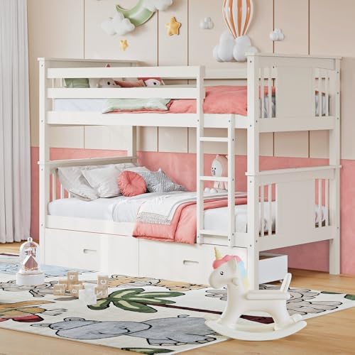 View full detailsBunk Bed Twin Over Twin with Storage Drawers, White Convertible Wood Twin Bunk Beds with Ladder and Safety Guardrail, No Box Spring Needed (White)