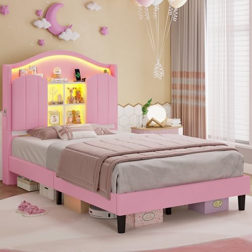 View full detailsBTHFST Twin Girl Bed with LED Lights & Charging Station, Upholstered Storage Headboard Platform Twin Size Princess Bed Frame, No Box Spring Needed/Noise-Free/Easy Assembly, Pink