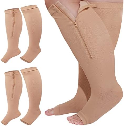 Hillban 2 Pair Plus Size Calf Zipper Compression Socks 15 to 25 Mmhg Open Toe Compression Stockings for Overweight Women Men