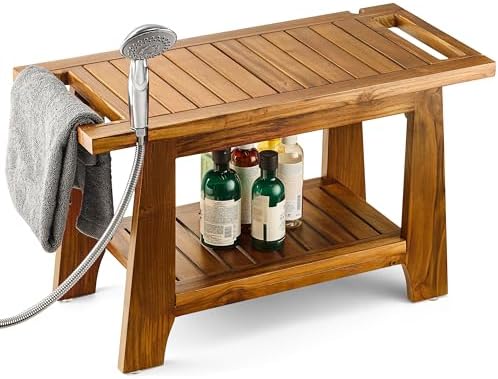 View full detailsTINAMO 28" Teak Shower Benches for Inside Shower - Wooden Shower Stool Waterproof for Shaving Legs - Bench Seat with Storage Towel Shelf for Bathroom - Chair Spa Bath Nail Shave (Teak Wood 28 Inch)