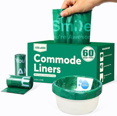 View full detailsCommode Liners with Super Absorbent Pads(60Bags+60Pads Pre-Inserted), Leak-Proof Bedside Commode Liners for Adult, Universal Commode Liners for Bedside Commode, Standard Toilet, Chair Bucket, Bedpan