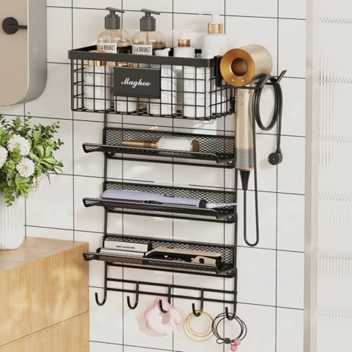 View full detailsHair Dryer Holder Wall Mounted, Adheisve Hair Styling Tool Organizer for hair Brush/Appliance Wall Mount with 5 Tier Shelf Basket Hooks Blow Dryer and Straightener Holder for Bathroom(Black)