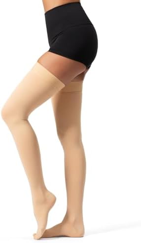 View full detailsNuVein Medical Compression Stockings, 20-30 mmHg Support, Women & Men Thigh Length Hose, Open Toe, Light Beige, X-Large (1 Pair)