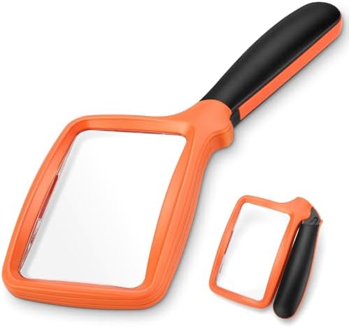 View full detailsFolding Handheld Magnifying Glass with Light, 3X Large Rectangle Reading Magnifier with Dimmable LED for Seniors with Macular Degeneration, Newspaper, Book, Small Print, Lighted for Low Visions Orange