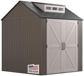View full detailsRubbermaid Large Vertical Resin Outdoor Storage Shed With Floor (6.2 x 4.6 Ft), Weather Resistant, Beige/Brown, Organization for Home/Backyard/Garden Tools/Lawn Mower/Bike Storage/Pool Supplies
