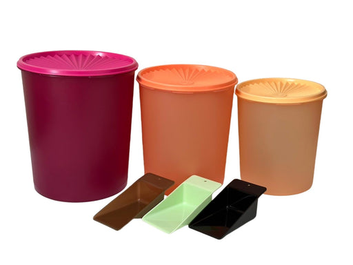 Brand: TupperwareColor: MulticolorFeatures: Tupperware Classic Servalier Heritage Decorator Canister Set of 3 with Flat Scoop Set includes: 2.7L /...