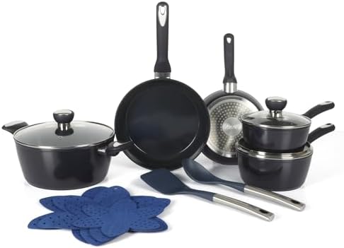 View full detailsOster Hawke 14 Piece Aluminum Premium PFA Free Ceramic Nonstick Blue Saphirre Pots and Pans Cookware Set W/Induction Base