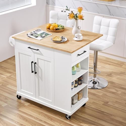 View full detailsYaheetech Rolling Kitchen Island Cart with Drop Leaf, Portable Rubberwood Breakfast Bar with Storage Cabinet, Open Shelves & Detachable Towel, 2 Drawers, White