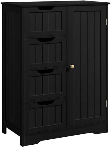 View full detailsYaheetech Wooden Storage Cabinet, Bathroom Storage Organizer with 4 Drawers & 1 Cupboard, Freestanding Cabinet Table for Bathroom, Entrance Area, Kitchen, Black
