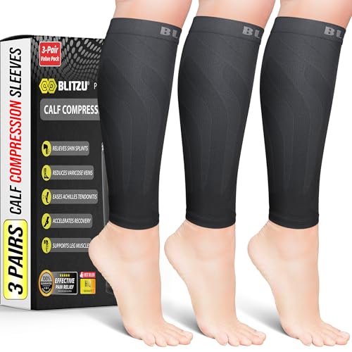 View full detailsBLITZU 3 Pairs Calf Compression Sleeves for Men and Women. Footless Compression Socks & Leg Support for Running, Travel, Nursing, Fitness. Shin Splints Pain Relief & Reduce Swelling Black L-XL