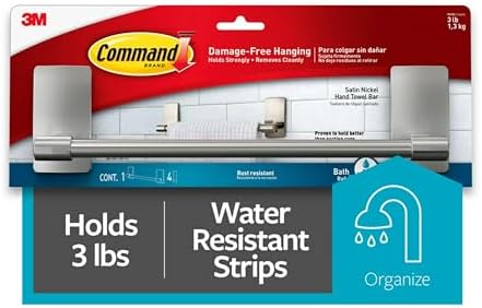 View full detailsCommand Hand Towel Bar Satin Nickel with 4 Water Resistant Command Strips, 9" Hand Towel Holder, Holds up to 3 lb, Great for Bathroom Décor on the Wall, Inside the Cabinet, or in the Shower