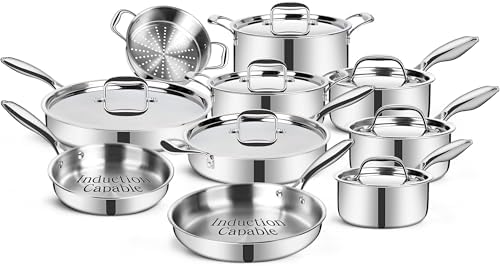 View full detailsEWFEN Stainless Steel Cookware Set, 3 Ply 17 Piece Stainless Steel Pot and Pan Set, Oven Dishwasher Safe | Induction Compatible Frying Pans, Saucepans, Saute Pan & Stock Pot, PFOA, PTFE & PFOS Free