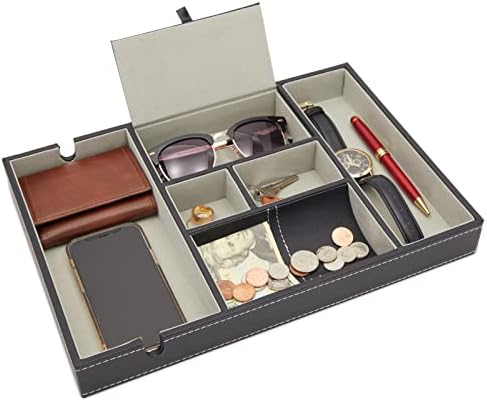 View full detailsJuvale Nightstand Organizer Tray - 14 x 10 x 1.5 in, Black Faux Leather - Valet Tray for Men with 6 Compartments for Watch, Jewelry & Keys