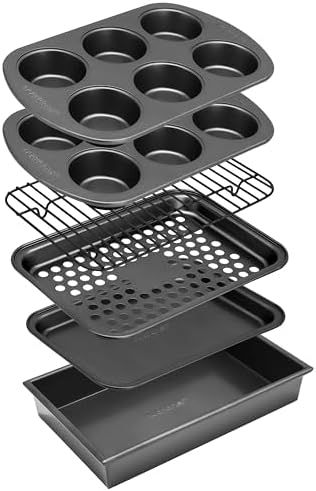 View full detailsNutriChef 6-Piece Toaster Oven Bakeware Set, Compact Non-Stick Stackable Baking Pan Set with Muffin Pans, Roasting Tray & Baking Sheets, Durable Stain-Resistant Carbon Steel Design for Toaster Ovens