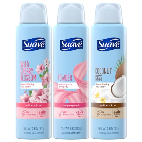 View full detailsSuave Deodorant for Women, Dry Spray Antiperspirant Variety Pack – Powder, Coconut Kiss & Cherry Blossom, Dries Instantly, 48H Protection, 3.8 Oz Ea (3 Piece Set)