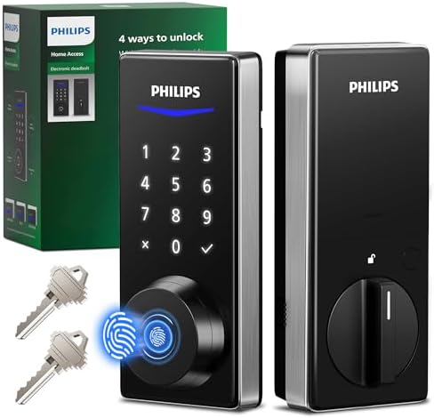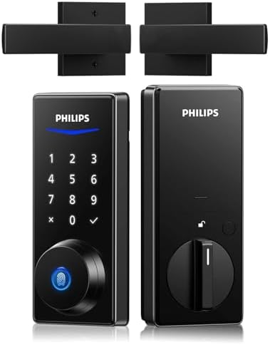 View full detailsPhilips Front Door Lock Set, Electronic Fingerprint Lock with 2 Lever Handles, Keyless Entry Door Lock with Handles, Auto Locking, Fingerprint Unlock, Touchscreen Keypad with Key