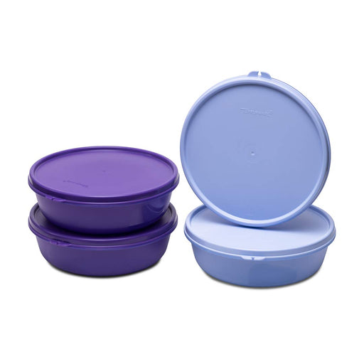 Brand: TupperwareColor: PurpleFeatures: Color is Royal Purple 3 Quart Capacity - Measures 9" square by 5" high with lid on 3 Piece Set - Base Cont...
