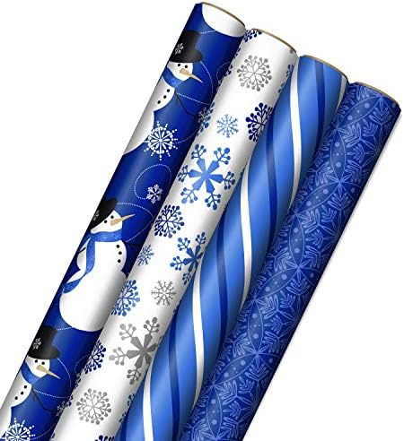 View full detailsImage Arts Blue Christmas Wrapping Paper with Cut Lines on Reverse (4 Rolls: 120 sq. ft. ttl) Snowmen, Snowflakes, Blue and White Stripes