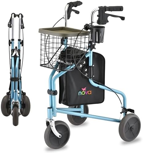 View full detailsNova Joy Traveler Folding 3 Wheel Walker with Tray, Basket and Pouch - Lightweight Mobility Aid for Seniors - 8 Inch Wheels - Essential for Tight Spaces and Travel - Sky Blue