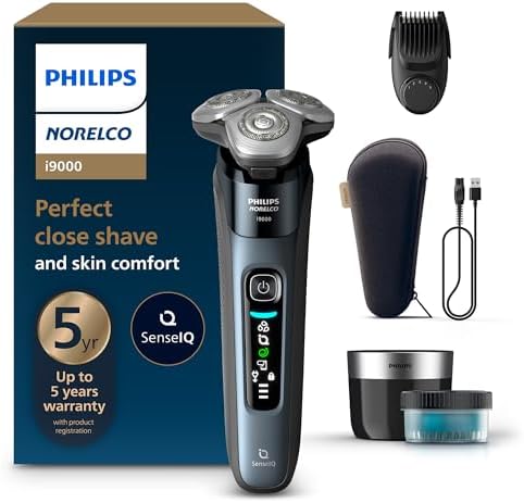View full detailsPhilips Norelco Shaver i9000, Wet & Dry Electric Shaver, Taubenblau, SenseIQ Technology, Triple Lift & Cut System, 360 Rotating Dual SteelPrecision Precision Blades, Beard Styler, Model X9001/91