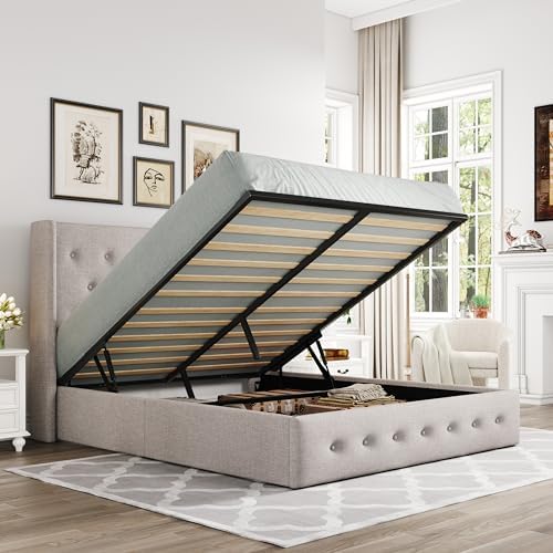 View full detailsAllewie Queen Size Lift Up Storage Bed, Button Tufted Headboard with Wingback, Hydraulic Support, No Box Spring Needed, Light Beige