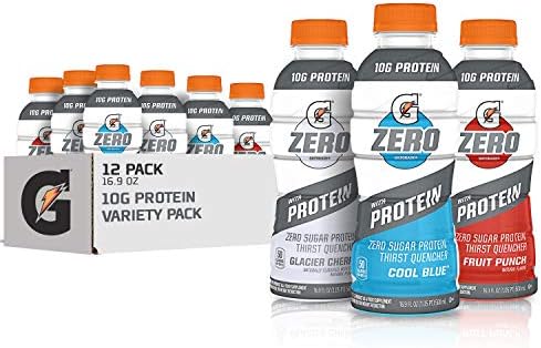 View full detailsGatorade Zero With Protein, 10g Whey Protein Isolate, Zero Sugar, Electrolytes, 3 Flavor Variety Pack, Liquid, Bottle, 16.9 Fl Oz, 12 Pack