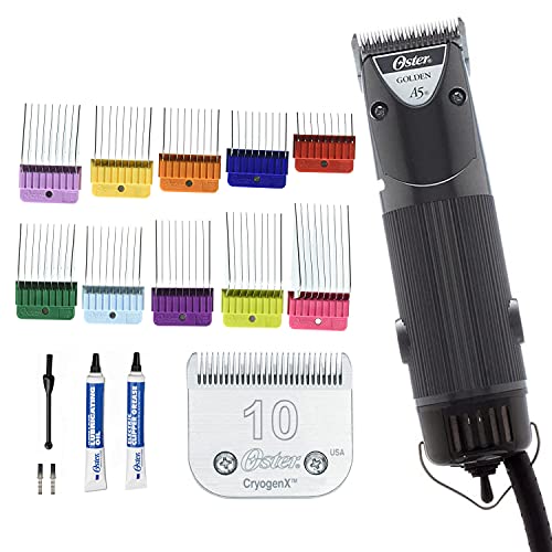 View full detailsOster Golden A5 Animal Pet 2-Speed Hair Clipper with Detachable CryogenX Size 10 Blade 10-Piece Stainless Steel Pet Clipper Guide Comb Kit (078936-100-000)