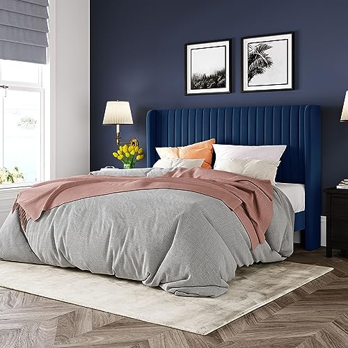 Allewie Full Size Velvet Bed Frame/Vertical Channel Tufted Wingback Headboard/Upholstered Platform Bed/Strong Wooden Slats/No Box Spring Needed/Easy Assembly/Blue
