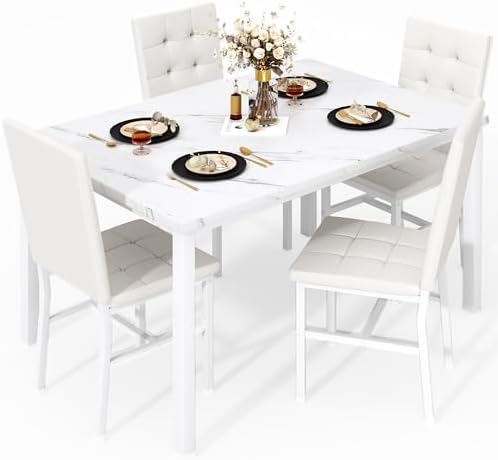 View full detailsAWQM Dining Table Set for 4,Faux Marble Kitchen Table and Chairs Set of 4, Modern Dining Room Table Set for 4,Dinner Table with 4 Leather Chairs, Dinette Set for Small Spaces,White