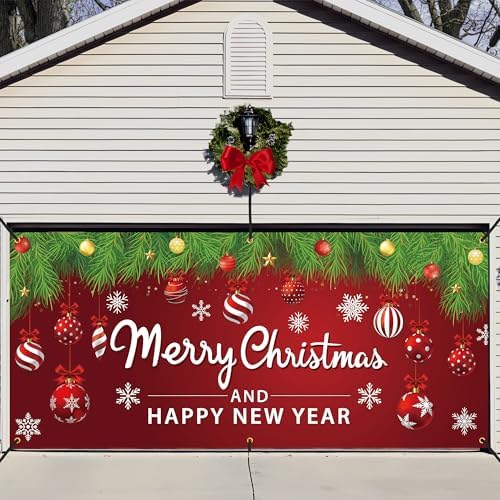 View full detailsChristmas Garage Door Banner 13 x 6 ft Xmas Ball Garage Banner Backdrop Red Merry Christmas Hanging Garages Fabric Mural for Outdoor Indoor Xmas Wall Garages Decoration
