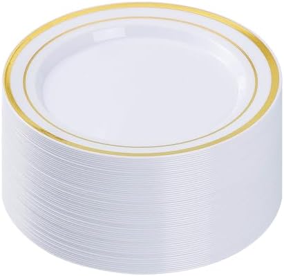 View full detailsBESTVIP 50PCS Gold Plastic Plates, 10.25 Inch Disposable Dinner Plate Party with Gold Rim, Heavy Duty Disposable Plastic Plates for Christmas, Thanksgiving, Party, Wedding and Birthday