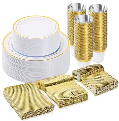 View full detailsBESTVIP 300PCS Plastic Dinnerware Set (50 Guests), Gold Disposable Plates for Party, Wedding, Christmas, Anniversary, Includes: Dinner Plates, Dessert Plates, Cups, Spoons, Forks and Knives