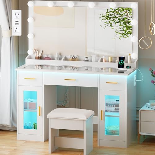 View full detailsBEWISHOME Vanity Desk with Mirror and Lights White Makeup Vanity Table with Glass Top & Stool,43.4" Large Makeup Desk with Power Outlet,3 Storage Drawers,Dressing Table for Bedroom Women,Girls FST35W